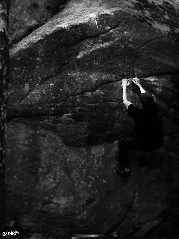 Blocket bakom "Fista en björn". Mantla upp vänster om sprickan på bullformationen! Även fötterna vänster om sprickan.