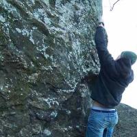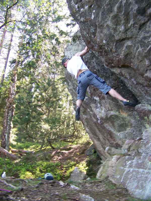 8 ??? 7B. Ej färdigklättrad. Start som "Sprickan" och traversera med underclings åt v. Hittills klättrad till traversens slut.